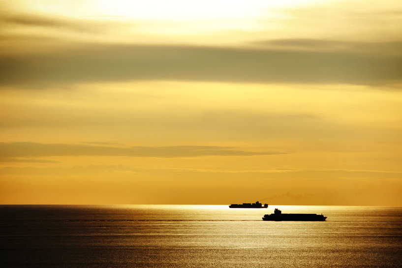 late afternoon in december 2010 at tanjung tuan lighthouse, melaka overlooking two distinctive cargo ships parting the malacca straits with some clearing of clouds to provide a harsh, bright lights and shadows. the golden tone was enhanced by setting the dslr white balance setting to shade.