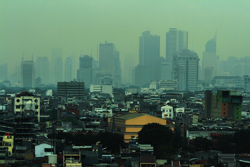 megacity jakarta, lens exposed from the comfort of a cozy 17th floor ibis hotel room at mangga dua presented its grim cityscrapers while surrounded by sprawling highly densed low cost housings. the greenish hue was the result of haze, pollution and approaching dusk.