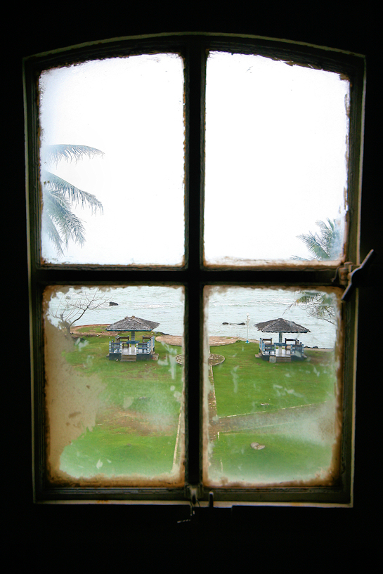 an outside view of the sunda strait coastline from the 4th level of the cikoneng/anyer lighthouse at anyer, banten province, framed by a decrepit glass window. it also exposed a grim history of being in a ventral position to stand witness to the incoming tsunami triggered by the krakatau 1883 eruptions that struck and wiped out the original lighthouse, where the remnant of the old foundation can be seen at centre left. rebuilt at the behest of king william iii of the netherlands, the new 17 floor 40m high lighthouse was completed in 1885.