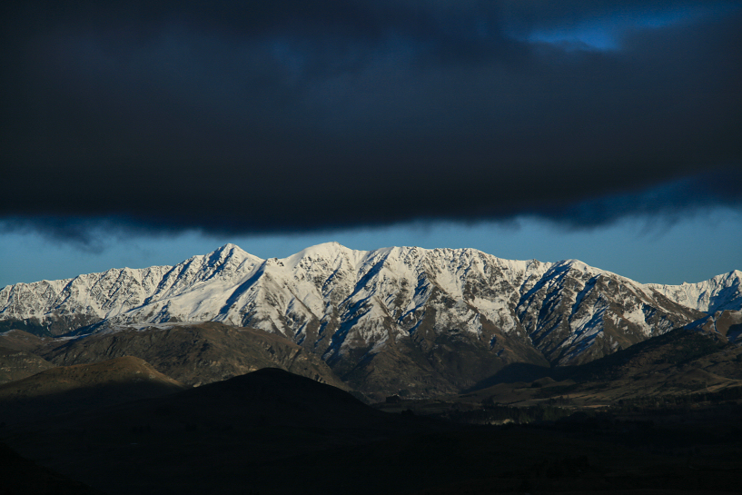 on a trip towards wanaka via the crown range road, the highest paved road in new zealand at 1,076 meters, the road winds steeply to an opening just a few feet fitted enough to park the car, i gently pulled aside and then walked out. looking back from the crown terrace towards the zigzag road beneath and the distant wakatipu basin, the infamous backdrop to queenstown – the remarkables, i had the opportunity to see the range from the less fanciful eastern slope, which was remarkably sandwiched between the upper formation of low cloud and its lower shaded farmland as borders. it was an exceptional moment firmly crystallized as soon as i released the shutter. june 2010.