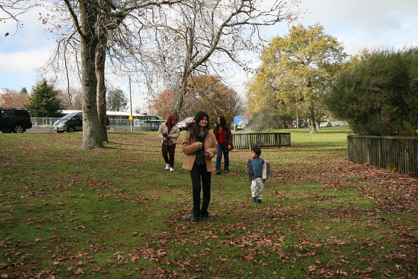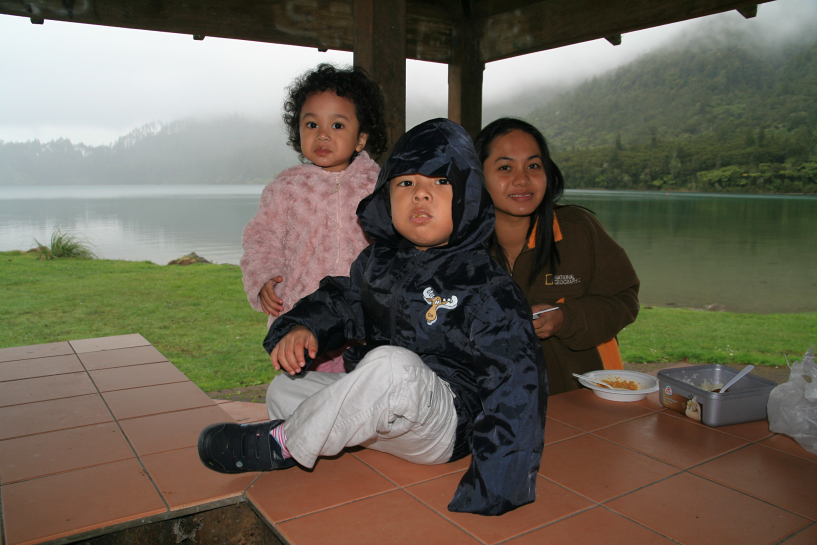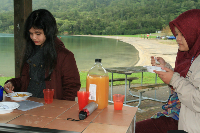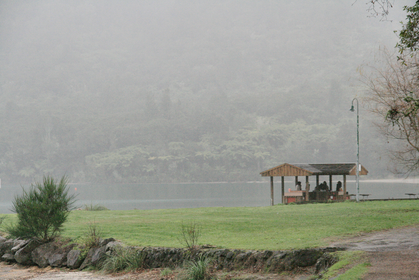 the smell. the moment i inhaled it, i knew that i was falling in love with the place. it’s unique odor closely resembled the smell of rotten eggs, but with an added sweetener and dry coconut gravy. our first stop of the day was at kuirau park, a public park in the centre of rotorua town. it’s also the best place to see geothermal pool for free, though not as magnificent as the others, it was ample enough for us to get the requisite feel of what a geothermal activity was all about. the stench was intense, all the more for me to love it. we walked along the dotted smoky pools for 30 minutes before we continued to the lakefront drive, fronting the massive lake rotorua. by the time we arrived, it started to rain and we got back inside the car and moved along the lakeside park for 5 km towards the south east, skirting a pine forest until we stopped at another smaller lake with a bbq shelter for our lunch break.