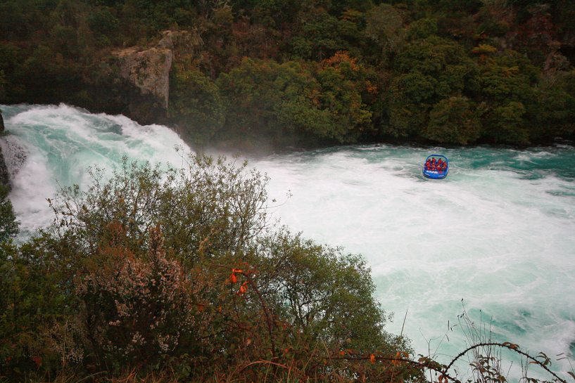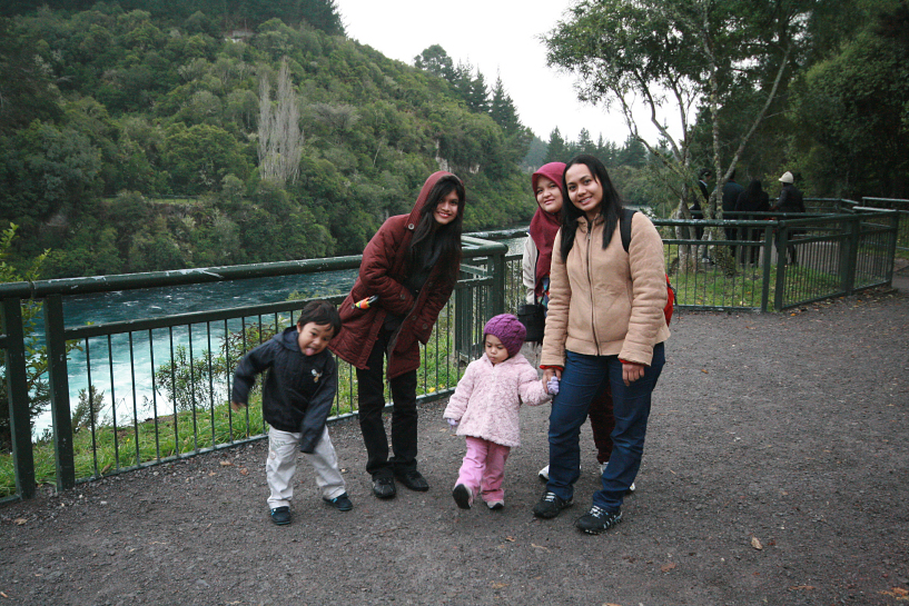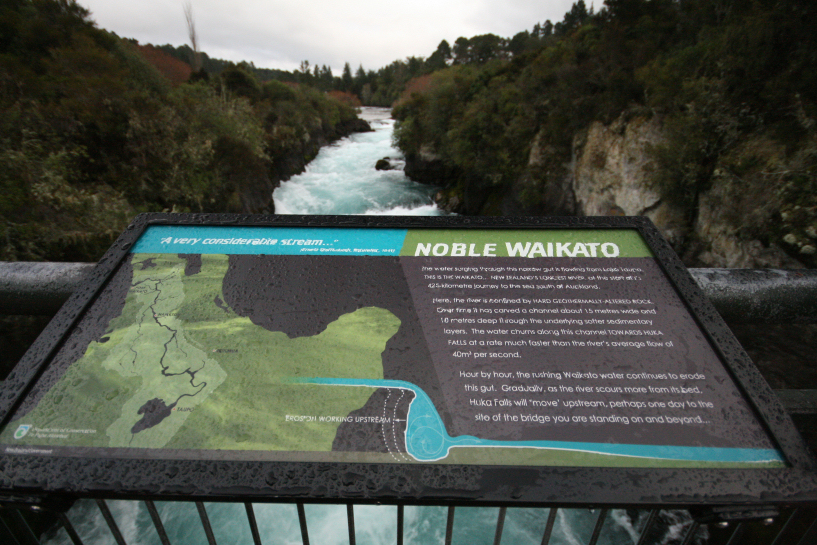 later when the highway (sh5) merged back with sh1, i knew that we were entering taupo. 2 km before taupo town, we pulled into a parking area next to huka falls. it was raining quite heavily and we had to use umbrellas to scuttle about 50m to the famous waterfall bridge over the waikato river. it drains from lake taupo 3 km upstream and narrows into a canyon 15m wide for 100m. by the time we reached the other side of the river, the rain stopped and we had a memorable moment watching the waterfall and jetboats from the east side.