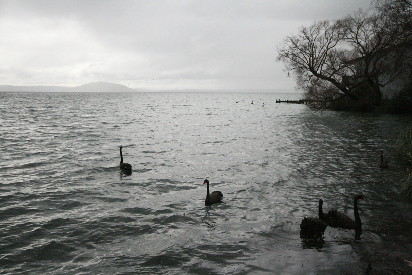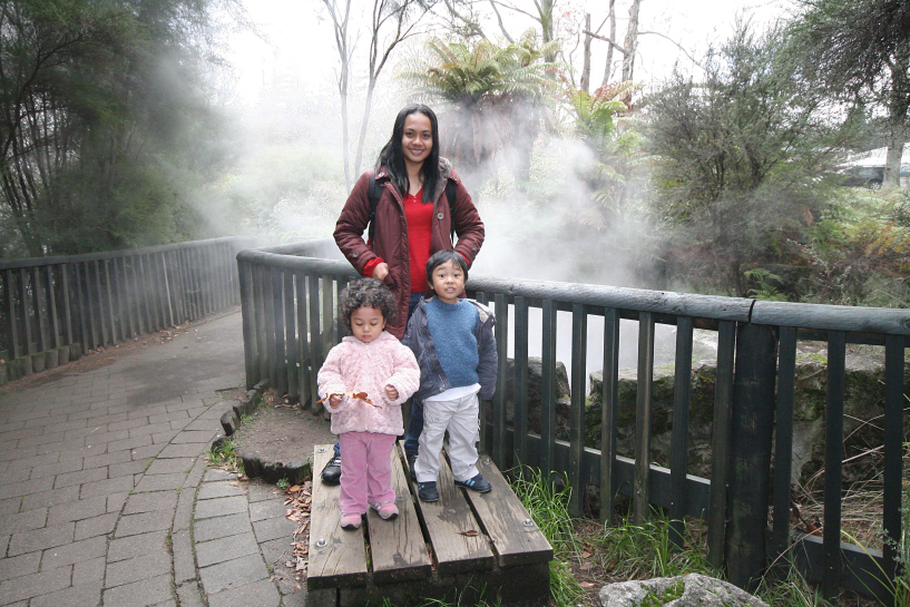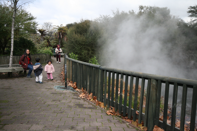 that morning, we had breakfast, packed our smaller bags into companion #2 and left the bigger ones at diman’s house. we left at 9:30 am and drove through the waikato region, again using sh1 towards the south, the heartland of maori culture and volcanic activities! the weather was cloudy with a hint of rain, the temp was quite mild, about 12°c. we passed through the town of cambridge, with trees lining the streets, and after tirau, we exited sh1 into sh5, known as thermal and explorer highway that brought us to rotorua. the distance between hamilton and rotorua is only 110 km, we took an hour to have our first glimpse of lake rotorua and when we entered the town centre, the sweet smell of sulphur invaded our nostrils almost immediately!