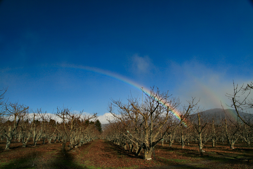 while driving along state highway 8 from lindiss pass towards the town of cromwell in central otago, i spotted this bright rainbow arcing its way across the town and proceeded to chase it until it became a double rainbow and ended near a citrus grove along state highway 6, well past the town. the roy-g-biv continued to shine for more than 10 minutes until it ceased its glow, uplifting my oomph in the process.