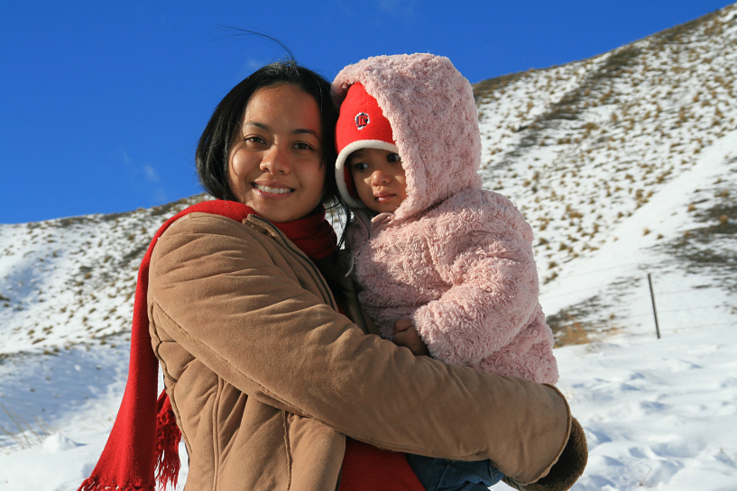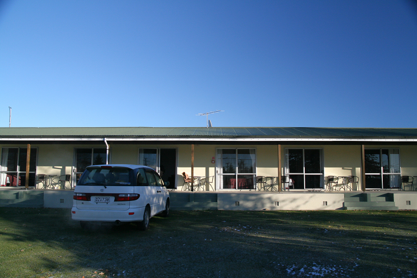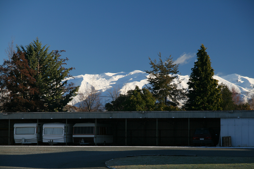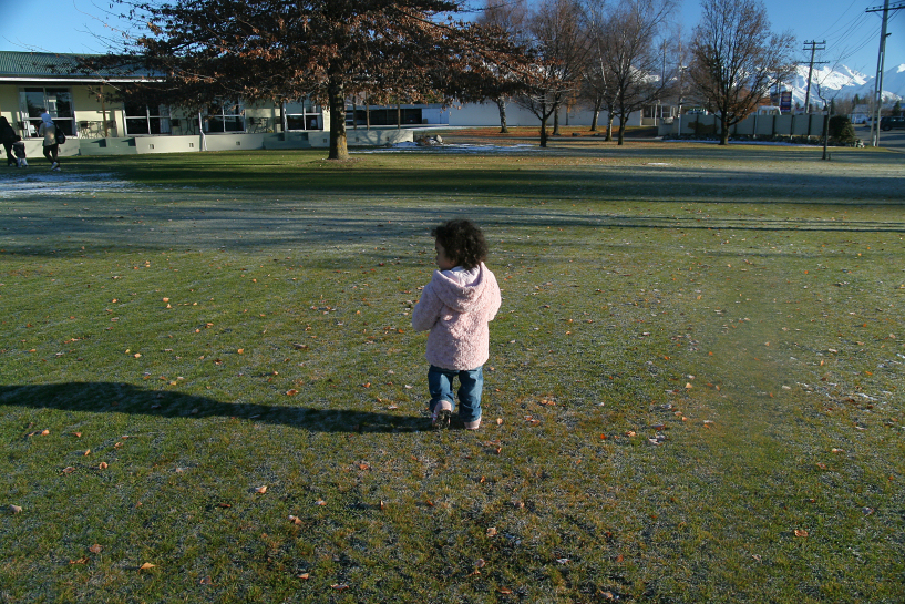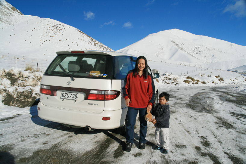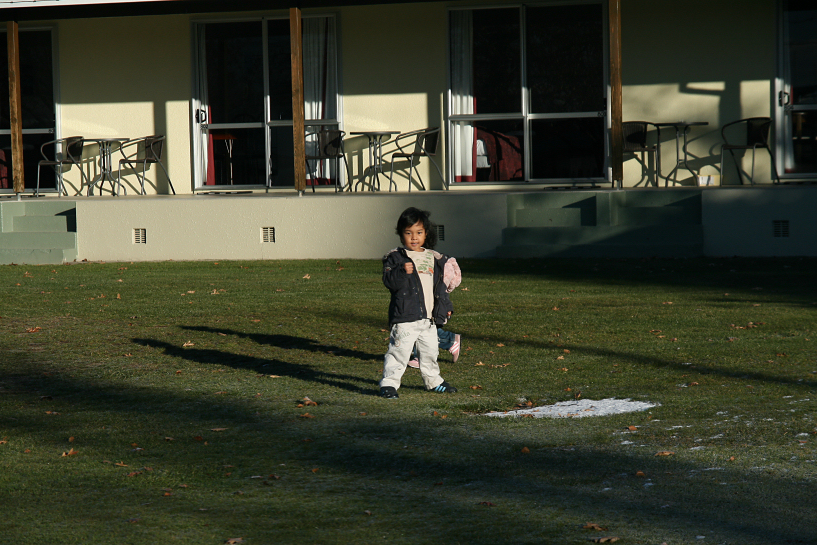 zack got back with some donuts, pastries and chips. i had a proper breakfast that morning and since it was so comfortable, i decided to checkout as late as possible. after brekky, i walked out to take our laundry and realized that it was mightily quiet inside the block and it was no wonder that zack, ija and aina got creeped out the night before. i took out the dried clothes and brought back to our place for zack to pack. we woke up the kids, ija and aina, forced them to eat at least something and brought the kids outdoor to let them play on the frozen ground. there were still patches of thin snow on the grass that fell on the day before. the temperature was 2°c. the backpackers area was quite large with designated place for caravans and ben ohau range could also be seen from a distance.
