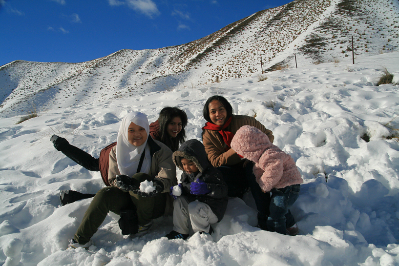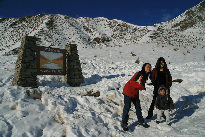 this time, they had enough snow to make a mini snowman, snow fighting and in alif’s case, eating more snow. alif and yomi kept insisting on putting snow inside an empty bottle (maybe to drink later) and we let them, again. the views were spectacular with white powdery ground contrasted to the deep blue sky. i stopped for half an hour until they were shivering with cold and we got back inside the car and moved away, going downhill through the otago region. both the kids wailed with frustrations when their snow melted.