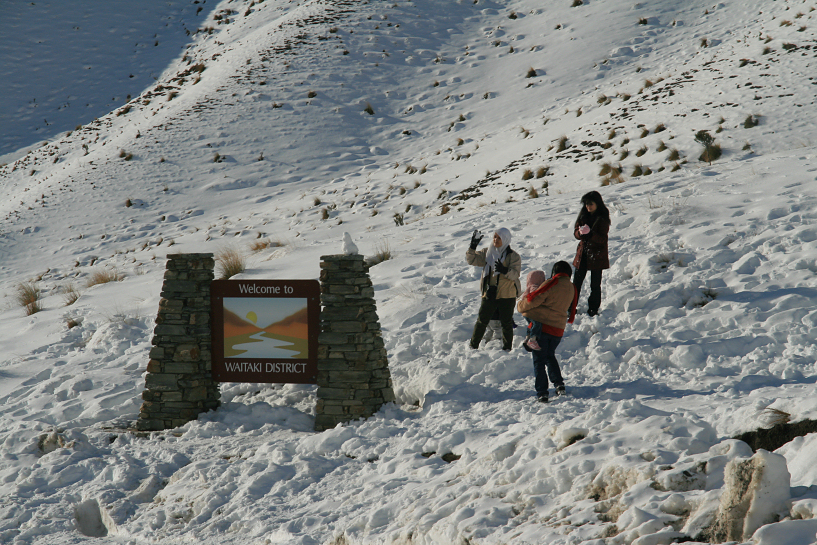 when we reached lindiss pass, the snow there was the thickest yet. i had to drive really slow and careful and started looking for a place to pull over. we found the place later, a scenic stop with a stacking slabs sign welcoming us to waitaki district.