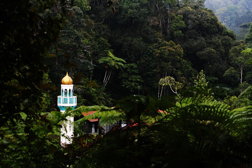 a mosque minaret juts out from the lush rainforest of fraser’s hill, pahang. taken from jalan ampang facing east after the family and i completed our abu suradi trail hike in december 2010.