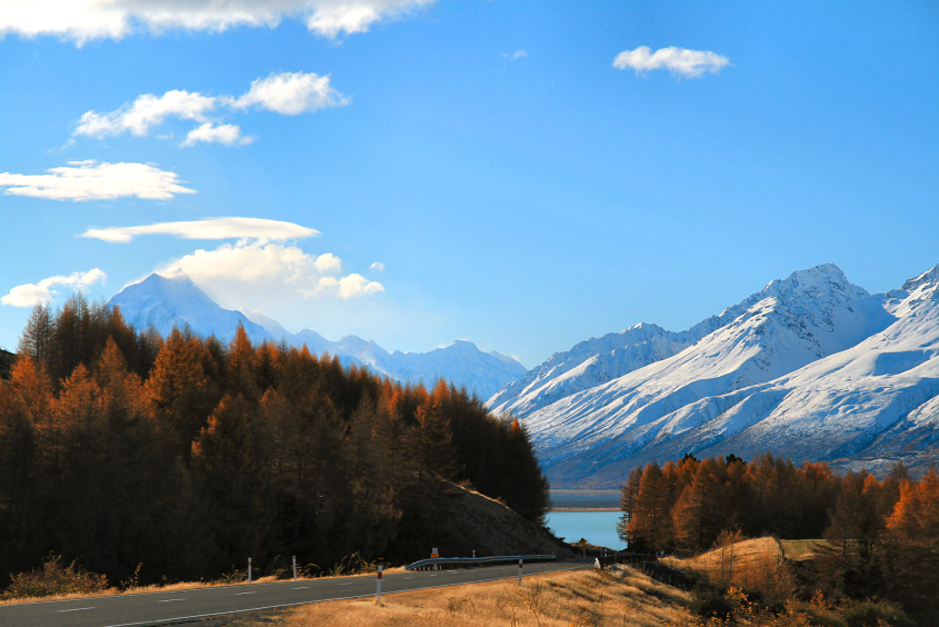 another picturesque angle while looking towards the north along state highway 80 with vivid colours of dying pines, lake pukaki, burnett mountains and the ever distinctive aoraki mount cook. june 2010.