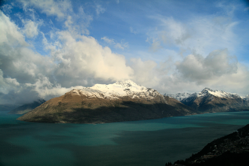 if you stood overlooking directly to the south from queenstown, a spectacle of extraordinary abundance lies in wait across lake wakatipu. cecil peak at 1,974m (left) and walter peak at 1,815m (right) are named after cecil walter rees, the son of the first settler of queenstown. the breathtaking panorama of the two most noticed peaks (unless if you happen to notice the vignetting first) from the town was photographed in june 2010.