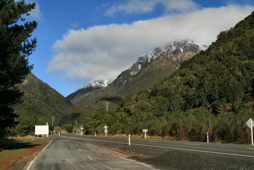 later, while descending the track, i met other travellers who came by to see what i just saw. reaching the carpark, i restarted the car engine and revved up back towards the hostel where the others were almost ready to depart for our journey. zack and the rests took turns in pulling the bags and the kids and zack went to yha hostel for one last time to check out. before we left franz josef town for good, we stopped at the town fuel station to fill up and zack also bought me an extra large power bar for breakfast. i ate my breakfast while driving northbound along sh6 with the morning mists set in.