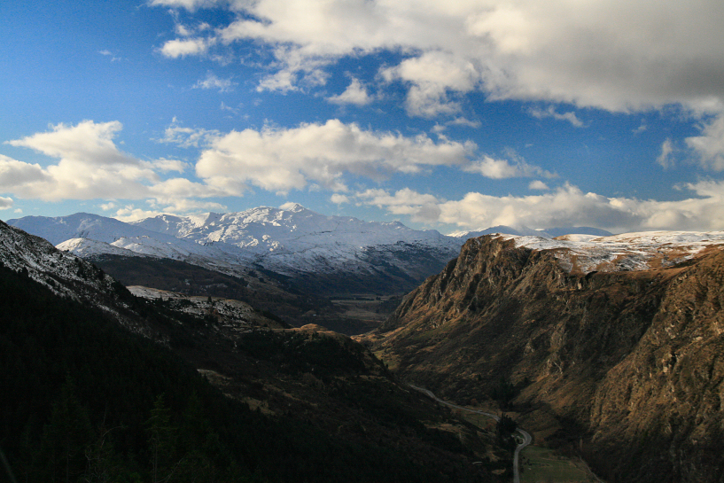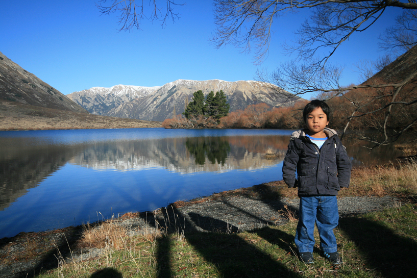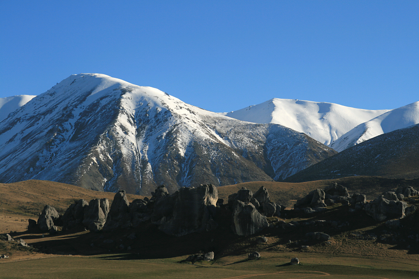 after crossing hokitika river and leaving the town, we left sh6 at kumara junction and entered sh73. the road winded through hills along taramakau river when i stopped for a smoke at otira, there the landscape becomes mountainous again and we started seeing snow again. the clouds cleared and became azure blue. by the time everybody was awake, i continued the journey climbing uphill and we entered arthurs pass national park. it was dry tussock land all over again, except this time, unlike the previous days, the snow was not in abundance. i careened the car carefully while traversing the mountains and i stopped once as the temptation was too much to handle and snapped a few photos. the road began to descend a bit until we met the picturesque lake pearson where i had to park and let the passengers roamed free and stretched their legs in the process. it was to be our last pretty lake on the whole trip. later, our views of the mountains was dotted by rocky boulders and we knew perfectly well that this place must be the location for those chasing of urukhais in lotr the two towers. If we had more time, i surely would have stopped and explored those rocks but a quick stop was enough at castle hill. the snow got thinner, we continued our drive and the road finally settled and we were back on the plains of canterbury.