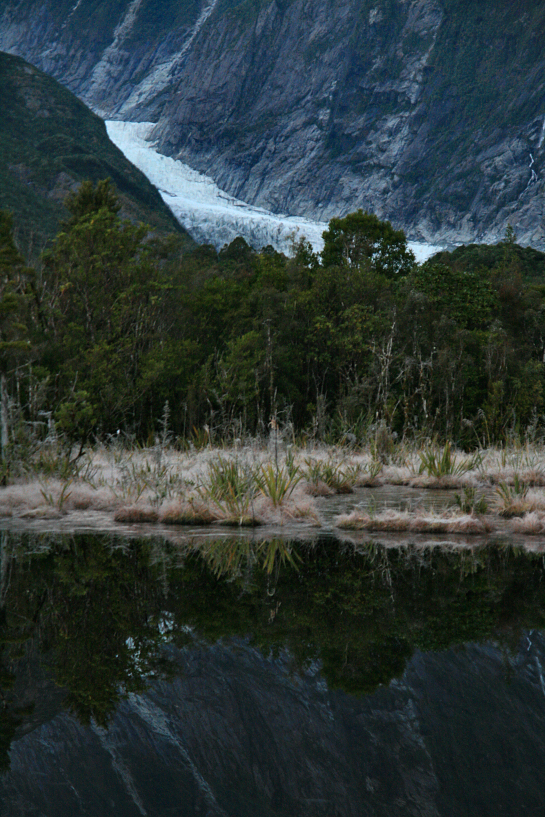 i woke up quite early that morning, the night before, i had already told them that come what may, the next morning i would go out hiking at franz josef glacier, which we missed the day before. they all agreed that none of them would follow my trip as they much needed the rest and would only be ready to depart as soon as i got back from the hike. as i left the hostel, it was still dark, the time was 7:30 am and alone, I drove slowly towards the glacier. it was a short distance, the carpark is not more than 4km from the town and my car was the only one there. by looking at the track signs, i decided to follow the path towards peters pool to have my first glimpse of the glacial terminus. it was an enlightening experience, walking alone, in the dense podocarp forest track, and at dawn, with the first hint of light shining through the leaves that took me almost 20 minutes to reach the pool. reaching the kettle lake, the views were magnificent, what with the semi frozen pool, supported by chirping morning birds and i stood there alone, near the pond’s edge, gazing at the terminal face of franz josef glacier and it felt like forever. i took out my cigarette, lighted it and inhale the smokes as slow as possible while absorbing the views and the soundless atmosphere, saved by the cries made by the local inhabitants. i tried to sit on a wooden bench after some time, but finding it too cold, i returned to my original position, standing up and looking at the serendipitously remarkable mountains, gradually lighted by the rising winter sun.