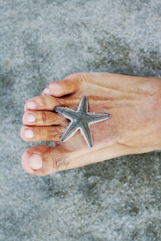a sand sifting sea star sifting on my nice looking but skeletal foot instead of its usual habitat. taken at pantai irama, bachok in august 2008.