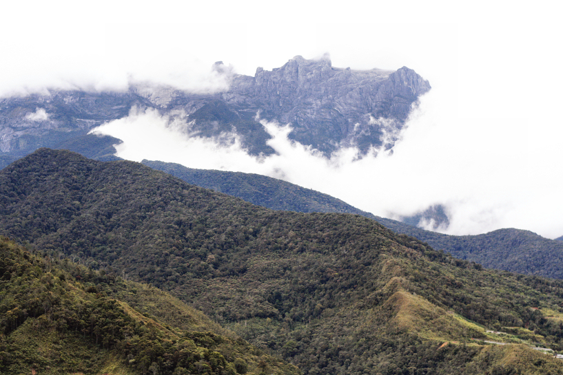 mount kinabalu at 4,095m, the tallest in borneo’s crocker range was partly covered by clouds as i snapped this photo from the town of kundasang, south of the mountain while facing north in july 2008. the summit, low’s peak is slightly visible in the centre of the frame.