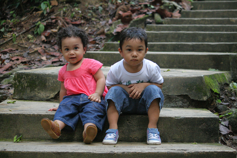 the not yet quarrelsome duo of alif and yomi on the steps leading to the 7 tiered kanching falls near rawang in october 2009. we didn’t reach the falls as they were still travellers in training (tits) then.
