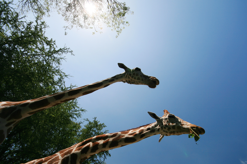 a pair of eager giraffes extended their long necks with coordinated pose during a feeding session at the national zoo of malaysia in february 2010.