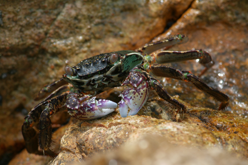 a rare encounter with a vibrant purple rock crab on the shore of air papan near mersing while exploring the seldom ventured rocky outcrops led to my hasty rush to bring out the camera from the bag and startling the crustacean in the process. luckily i managed to snap this photo just micro second before it vanished from sight. march 2011.