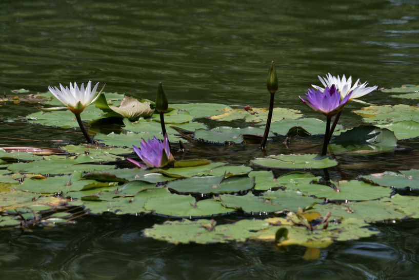 blooming water lily flowers on a hot noon in april 2011. taken at a pond in the main lobby of impiana resort cherating, pahang.