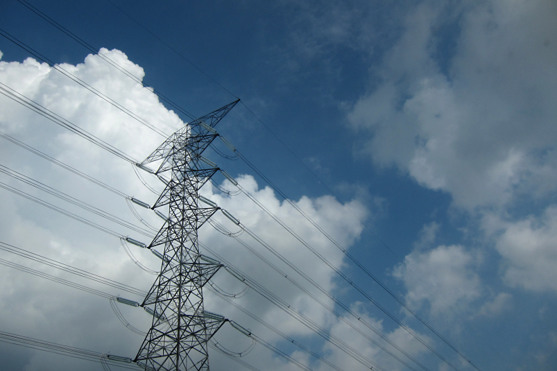 a 132 kv electric power transmission creates a grid (within the national power grid) against the sky near jalan kuching in kuala lumpur. the pylon and its overhead power lines are an eyesore for landscape photography but once in a while you just have to make do with what you got. pic was taken using the new canon s95 looking towards southeast. august 2011.