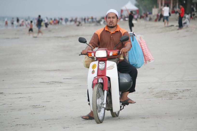 an ice cream peddler skirting on the edge of the beachfront at pantai irama, bachok in june 2011.