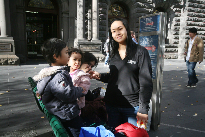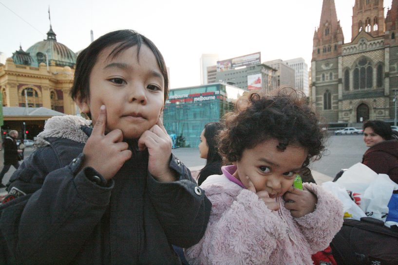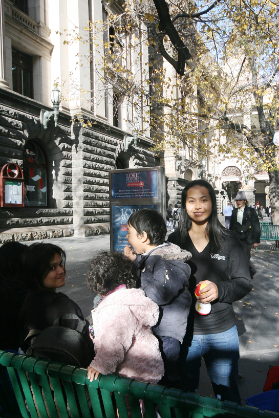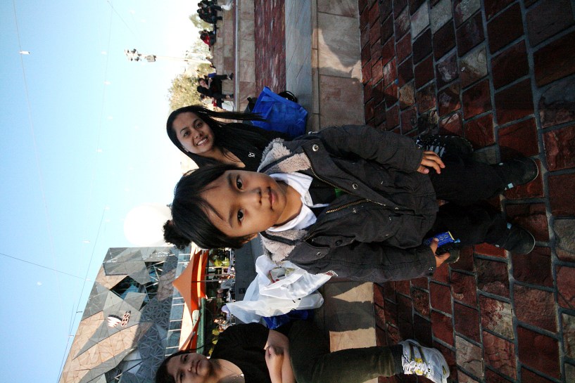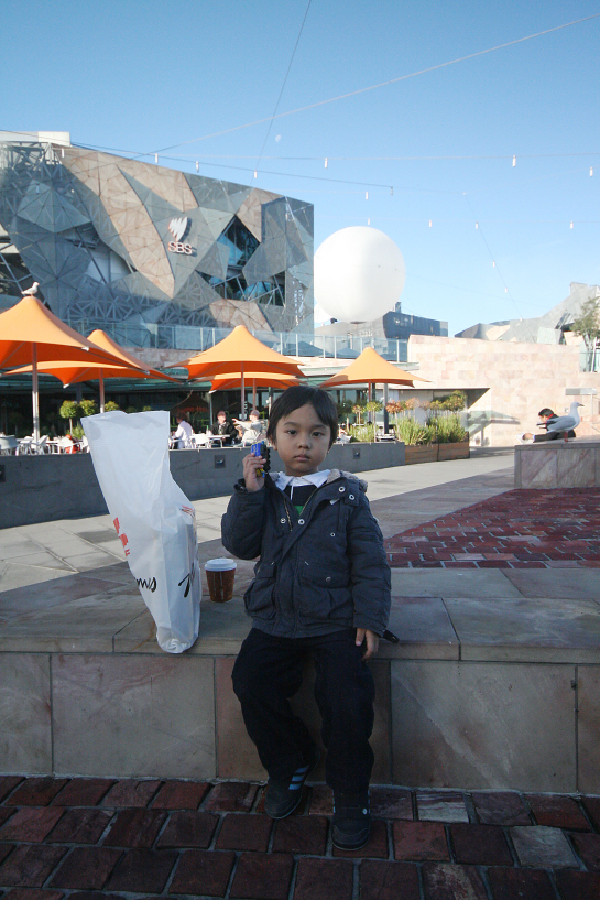 we started our day trip by walking to the left of the station towards the north along spencer st. then we crossed over the road and turned right into lonsdale st where we proceeded to walk for 2 blocks before we turned left again into william st., another 2 blocks later we came to the edge of flagstaff gardens and we turned right again into la trobe st. and later turned left into queen st. facing north again. by that time both kids were already on our shoulders and my body began to ache and sweat, i also realized that the pedestrian was also getting fewer and i began to wonder whether we took the right direction. on reaching the junction to franklin st. we stopped at a convenience store where we bought some choc bars, potato chips and drinks and since iโm out of cigarettes, bought a 25s mild pall mall for aud14. we met lots of trams along the way, much to the delight of alif and yomi. further along the road, later, we arrived at our first destination, the queen victoria market. surpisingly we found that the area was deserted and when i asked one of the workers there we were told that the place was opened 6 days a week and only closed on mondays! everybody was frustrated with the bit of info and we just sat on the benches aimlessly eating our junk food. when everybody had regained their strengths back, we skirted along therry st. until we reached and entered a mcdonaldโs where the road converges with elizabeth st, which by then was getting crowded again. we spent more than an hour there having our lunch of fish fillets, fries and cokes, and rechecking my small free folded map of the city.