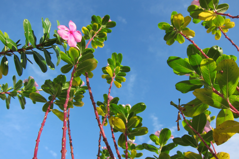 a low angle shot of madagascar periwinkle, a cultivated garden plants taken against the blue sky near my parents’ home in ketereh, kelantan. august 2011.