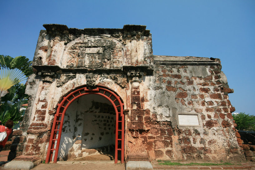 a rear view of a famosa, one of the oldest surviving european architectural remains in asia. built by the portuguese in the 17th century, the fortress in malacca changed hands multiple times to the dutch and ultimately the english, which ordered its destruction in 1806 except the small gate house porta de santiago (with the intervention of sir stamford raffles, who had a knack for history) in the picture above. unfortunately at that time, the front view was littered with tourists and against the sun, hence the less dramatic view. taken on a cloudless noon in july 2009.