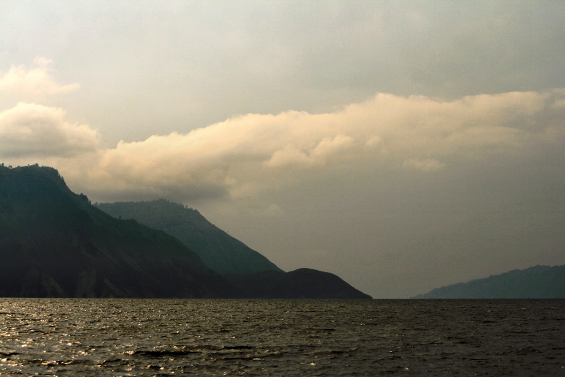 lake toba, parapat town and the looming mountains/caldera taken from danau toba cottage. north sumatra december 2011.