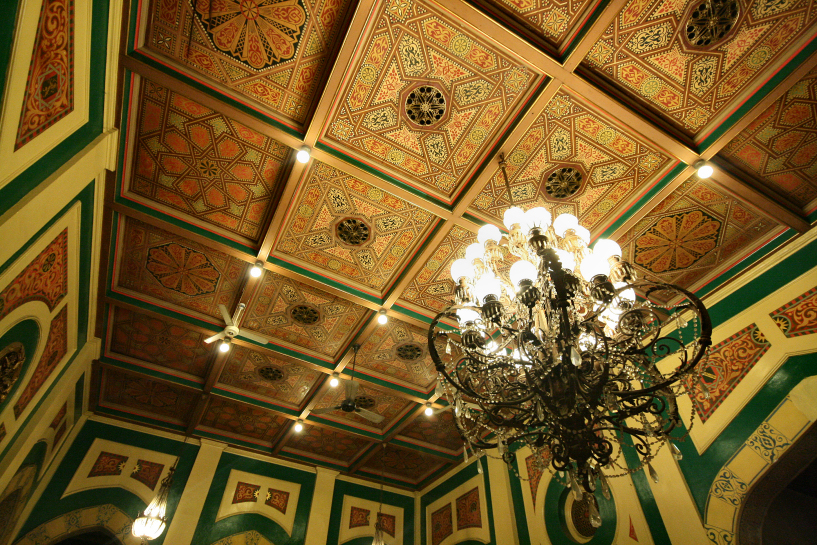 a highly decorative and unique interior design of the ceiling inside the main hall of maimun palace in medan, the fourth largest city in indonesia. december 2011.