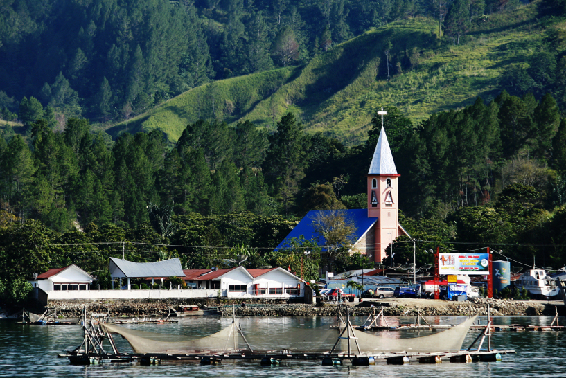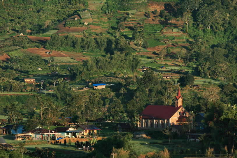 a village community church stands among the lush valley of vegetables and fruit crops at gundaling hill near berastagi on a quiet and cool saturday morning. december 2011.