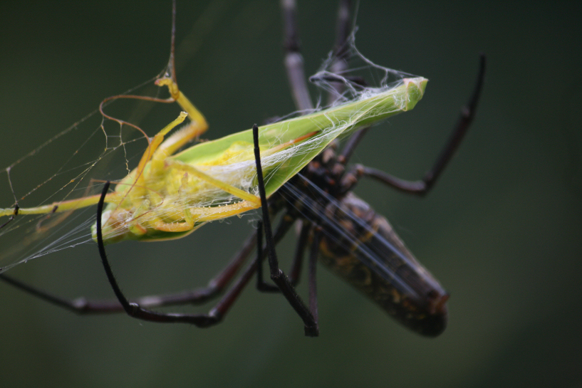 the predator and the prey. a female batik golden orb weaver and a most unfortunate katydid. ketereh, kelantan june 2011.