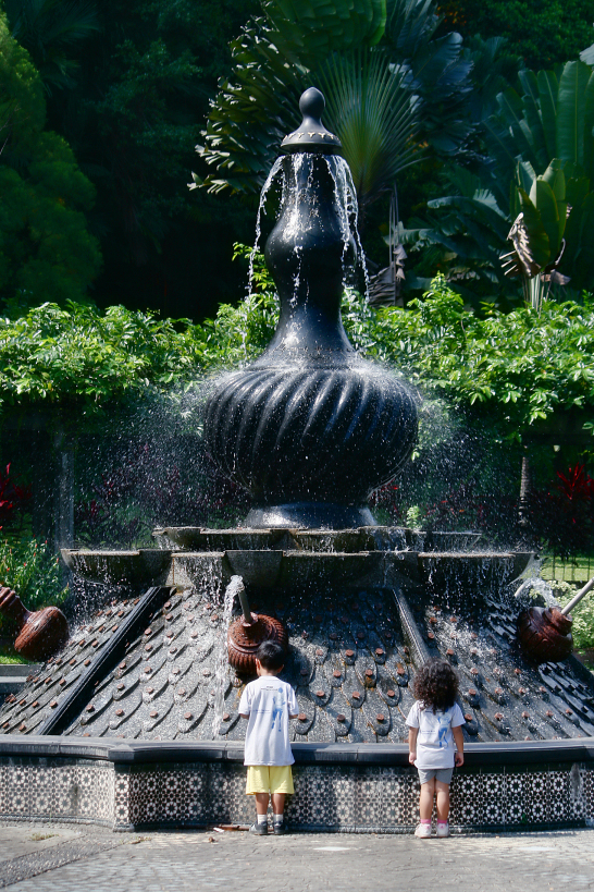 the two kids were enthralled by the huge sayong clay pitcher fountain which they found along jalan parlimen, kuala lumpur while returning to the parked car after completing the 2011 terry fox run. november 2011.