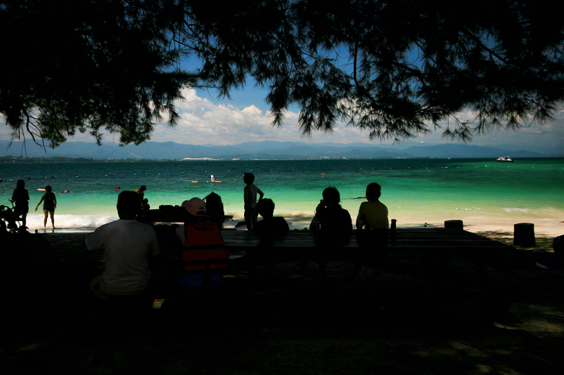 the clear green waters off mamutik island, framed by silhouettes of casuarina leaves and human visitors, pervades beauty as far as the eyes could see. looking towards the main island of borneo, june 2011.