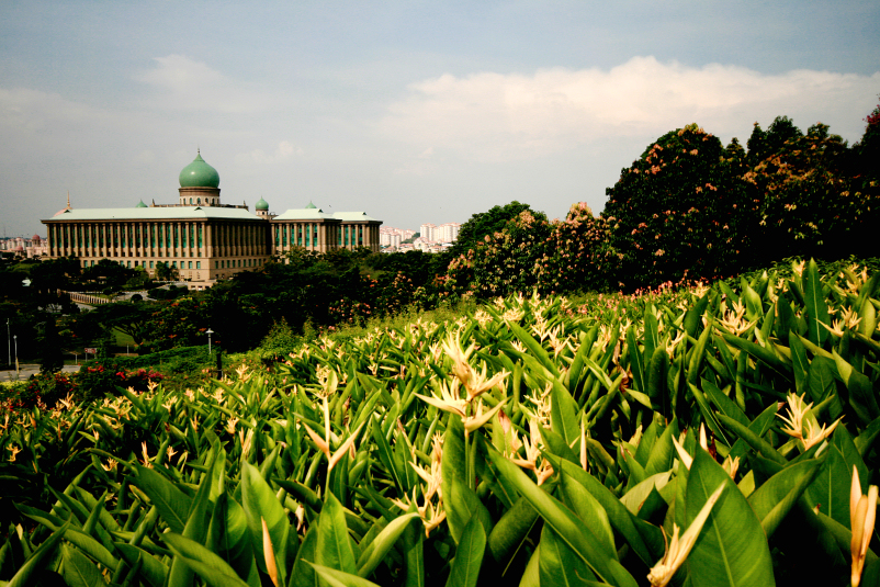 the perdana putra building which houses the office complex of the prime minister of malaysia in putrajaya, taken from putra perdana park. january 2012.