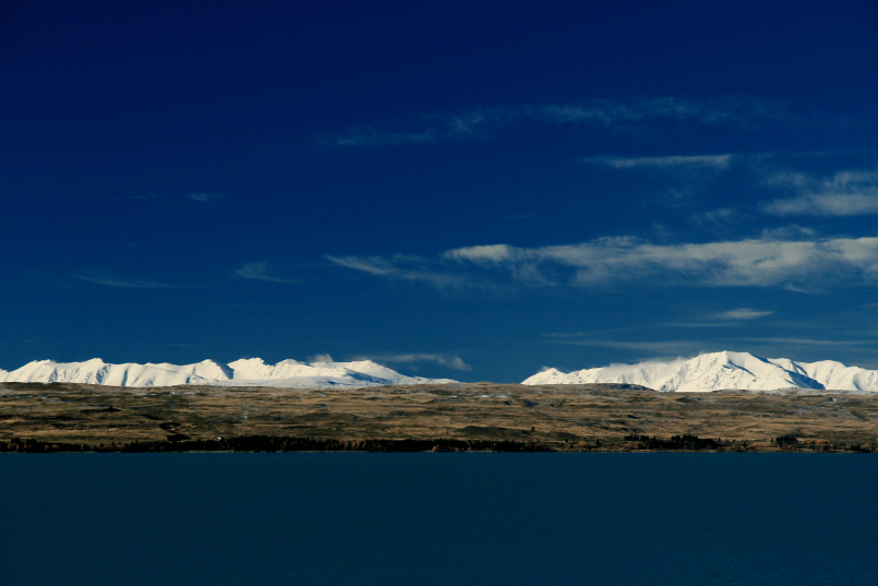 views of the snow clad two thumbs and rollesby ranges over the moraine-dammed lake pukaki. mackenzie basin, june 2010.