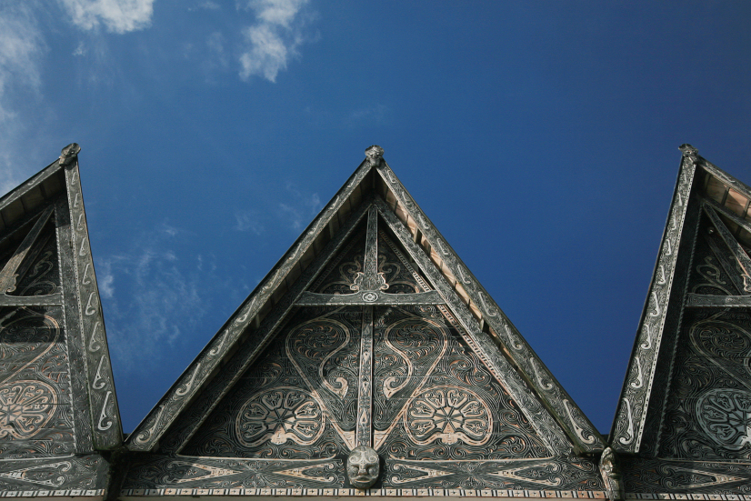 intricate boat shaped and upsweeping roof ridges of the rich batak architecture‘s toba batak at parapat town, north sumatra. december 2011.