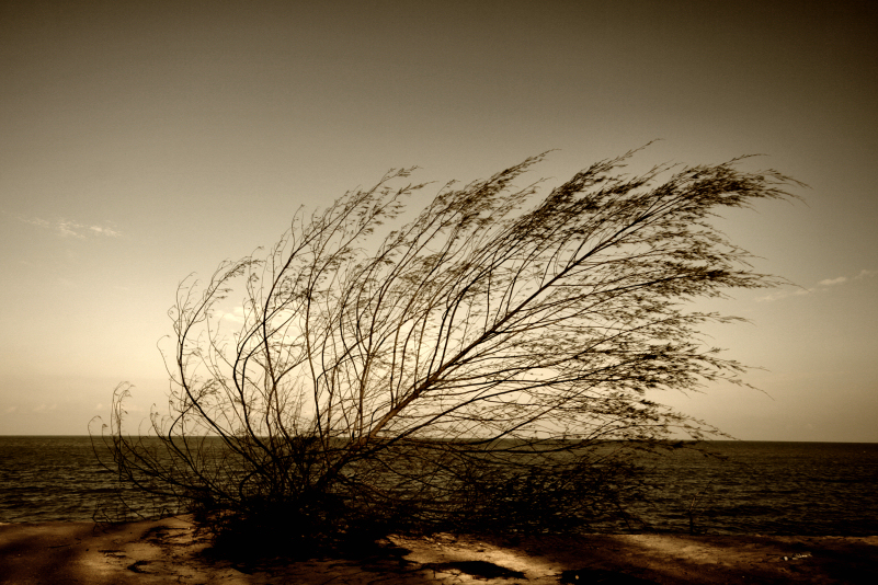 bent casuarina tree against the monsoon wind from the south china sea near cherating beach, pahang. april 2011.