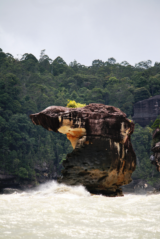an iconic landmark of bako national park, the famous cobra head sea stack in rough waters during the monsoon season. february 2011.