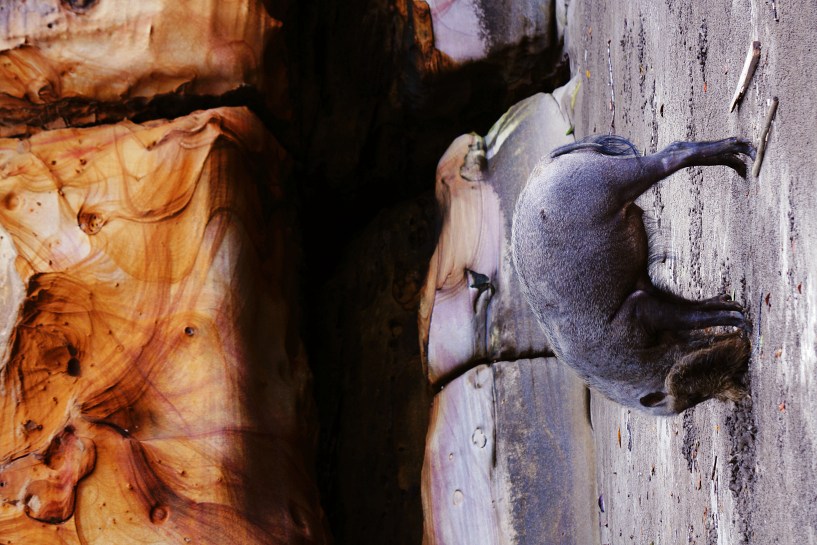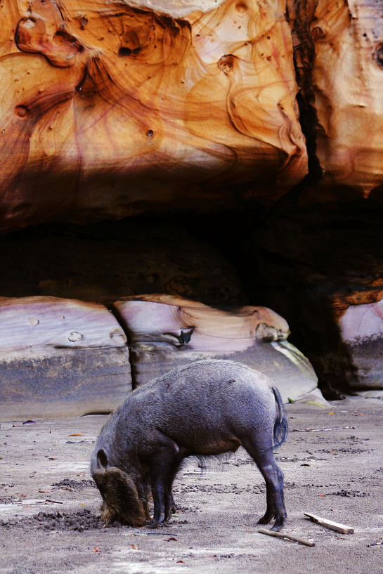 a bearded bornean pig foraging for food curtained by a wall of sandstones on the beach of telok assam, bako national park. february 2011.