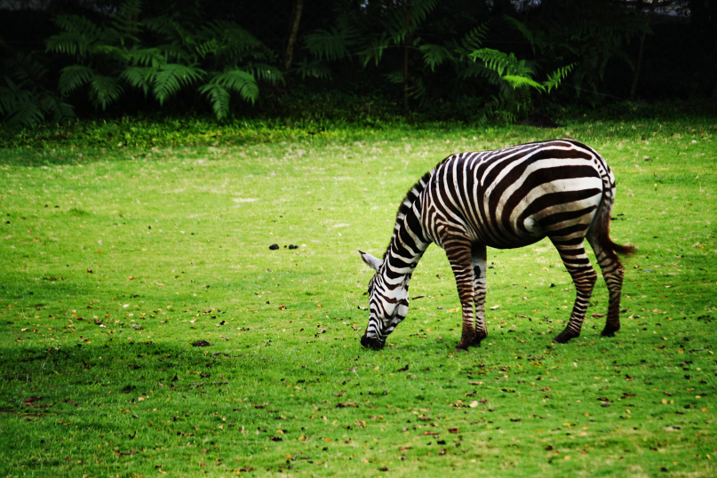 a very recent photo of a grazing zebra at taman safari indonesia II at the foot of mt. arjuno (3,339m) near pasuruan, east java. february 2012.