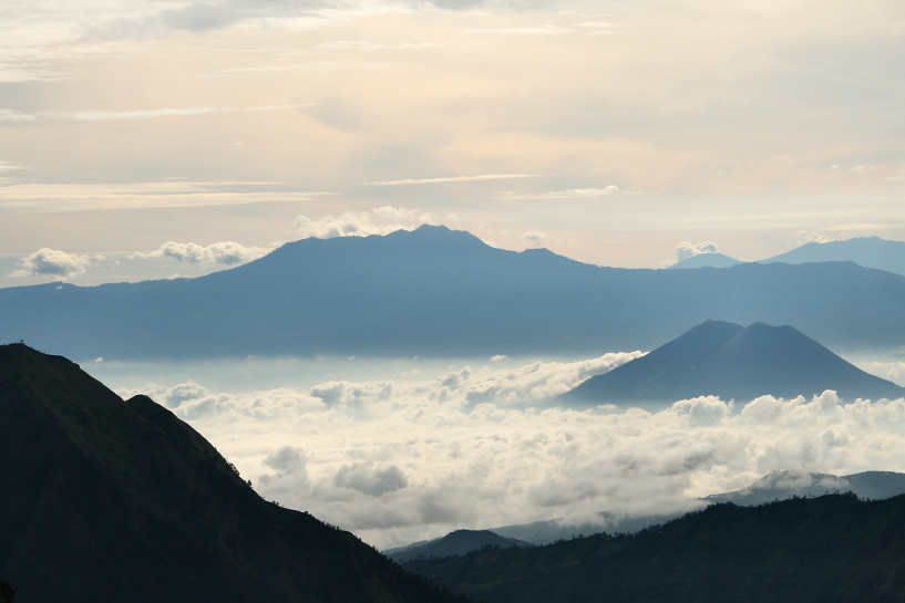 we were unlucky to have a cloudy sunrise atop mt. pananjakan (2,770m) on the tengger caldera rim looking south towards the expansive views of mt. batok (2,470m – foreground), mt. bromo (2,329m – on the left with the large crater) and the distant mt. semeru (3,676m – behind the clouds, the highest in java). an hour later our luck changed! february 2012.