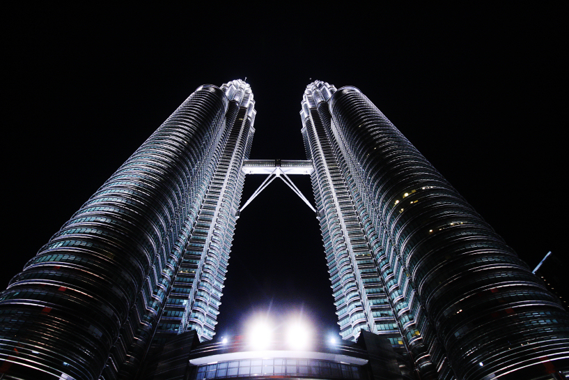 light enhanced contour of the steel and glass facade of the symmetrical petronas twin towers in kuala lumpur city centre. january 2012.