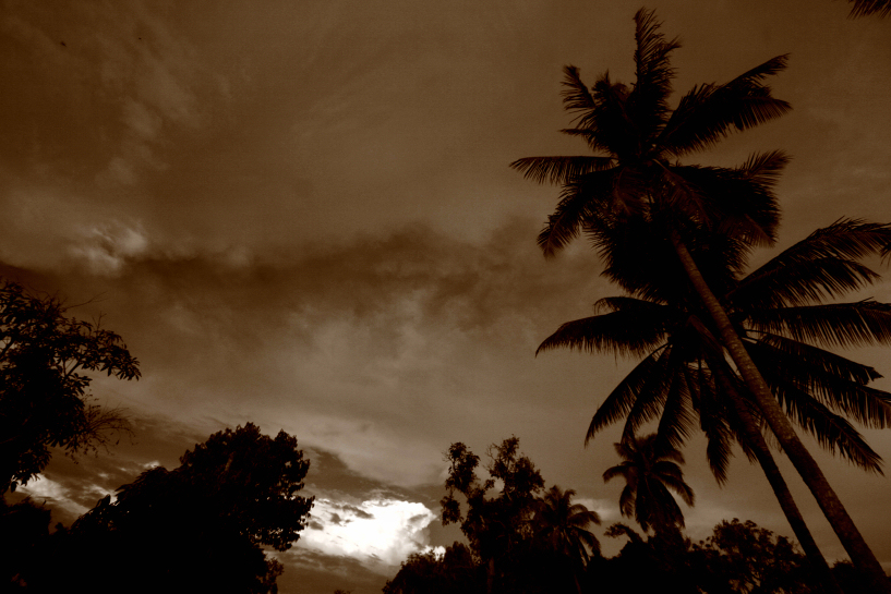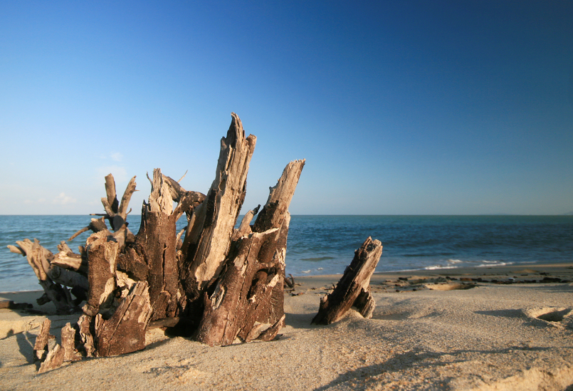 the south china sea, and the staple of coastal erosion at cherating beach, dead trees. april 2011.