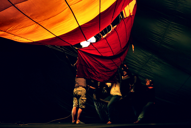 ground crew members help to support the wicker basket of a partially inflated hot air balloon for an upright position during a night glow show at the 4th putrajaya international hot air balloon fiesta. putrajaya march 2012.