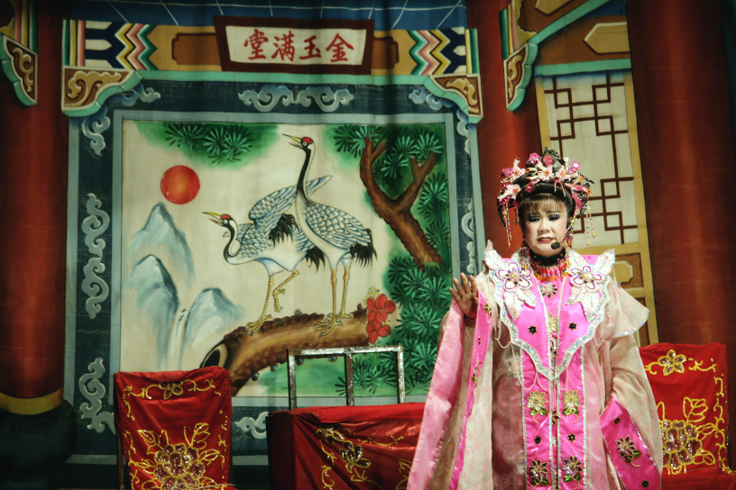 an opera singer performing in front of rows of empty chairs designated for the dead during the hungry ghost festival. taman sri sinar, kepong september 2012.