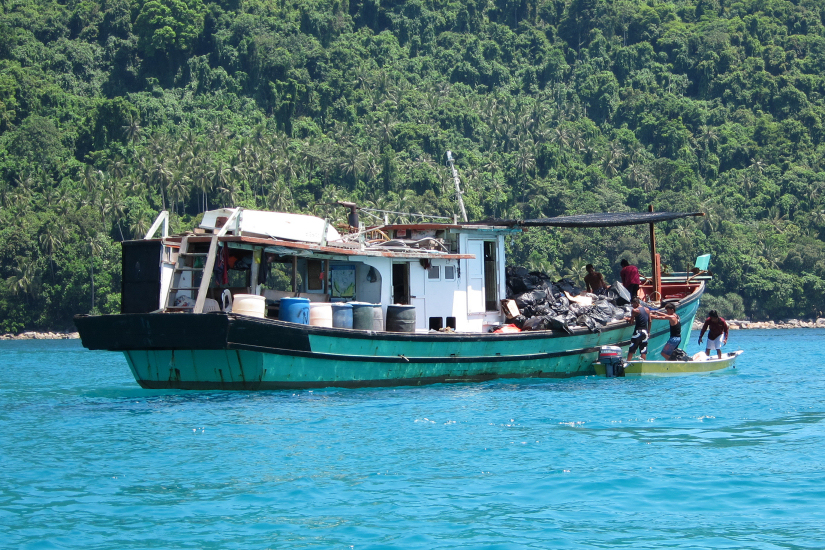 a fishing boat wedged on a sand at gandoriah beach, with the indian ocean as the backdrop. pariaman, west sumatra january 2013.