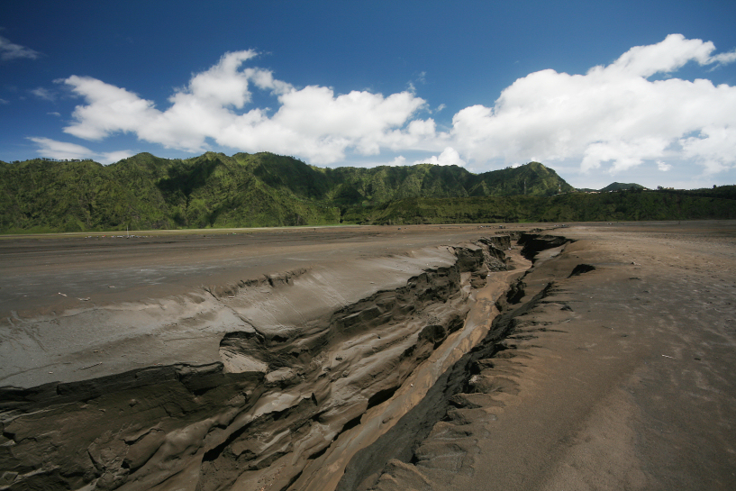 on the plains of bromo tengger semeru national park, taken from the sea of sand and looking towards the caldera rim of mt. bromo and the town of cemoro lawang. east java february 2012.
