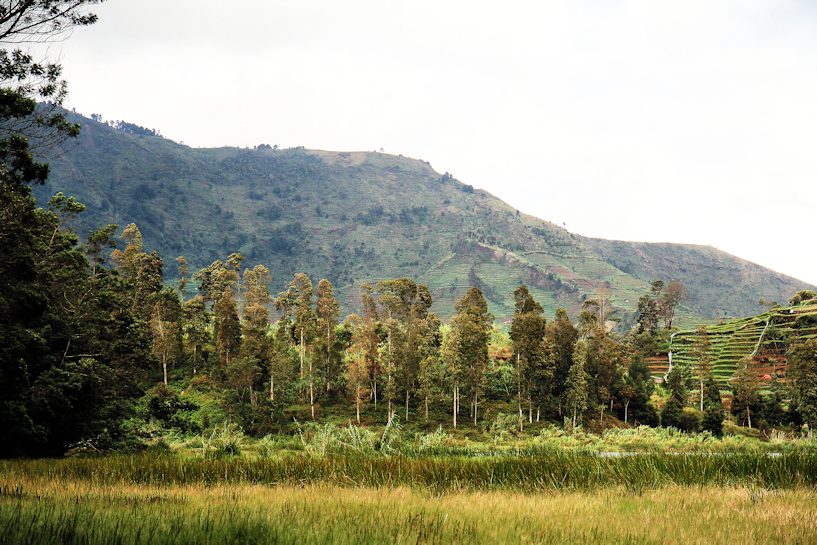 views of terraced farming enroute to the geothermally active dieng plateau near wonosobo, central java. february 2011.
